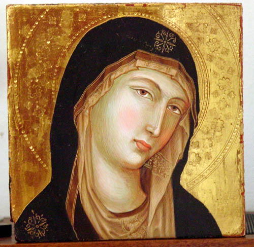 We walked slowly back to our room. Along the way, we stopped at Bottega d'Arte, This is a store, run by Chiara Perinetti Casoni, with art painted after the medieval style of Siena using egg tempera on gold leaf on wood; the woman that runs the shop actually teaches local students how to paint in this old style (and, in the style of those times, she has them do the leafing and underpainting and she completes the details). We purchased a small painting of the Madonna based on a work by Ugolino di Nerio of Siena from the 14th century. I think its beautiful.
