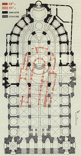 We visited the old church of St. Sulpice. Construction began in 1646 in the shadow of St. Germain des Prés. It was built on top of an older building, whose remants are visible in the crypt. Below is a schema of the various constructions undertaken at St. Sulpice.