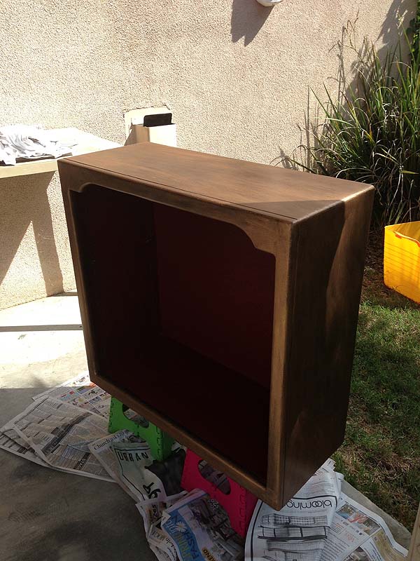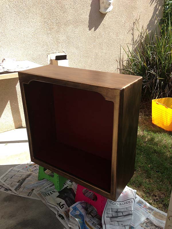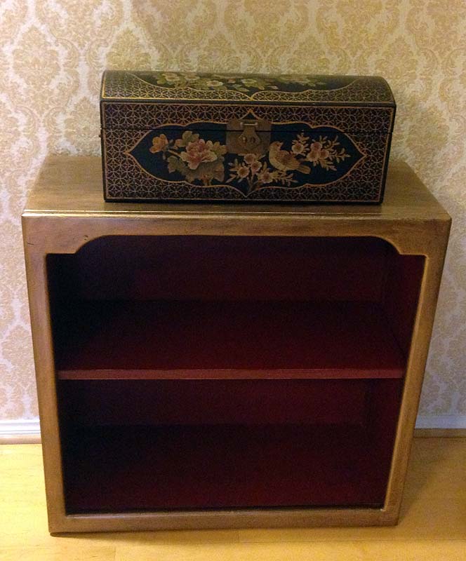 Aviva has been looking for something to put an oriental box on for a while – she found a black shelf with red interior at a neighbor’s (they run a regular yard sale of furniture). We got some gold wax and applied it, first thinned with mineral spirits, then direct from the can. We think it came out great!